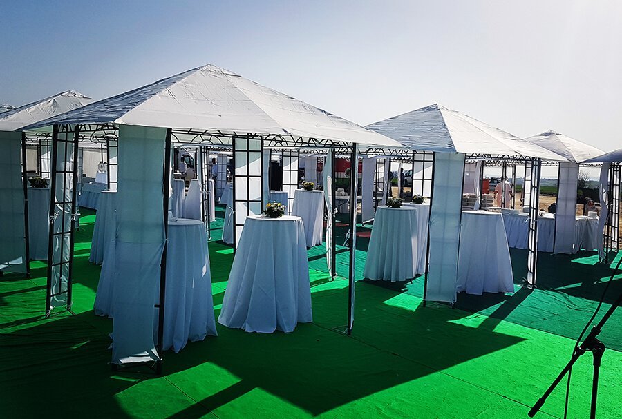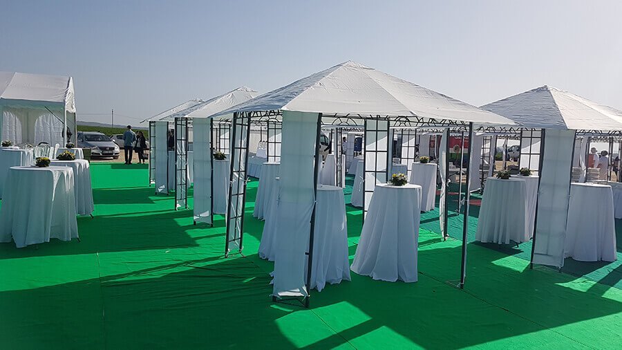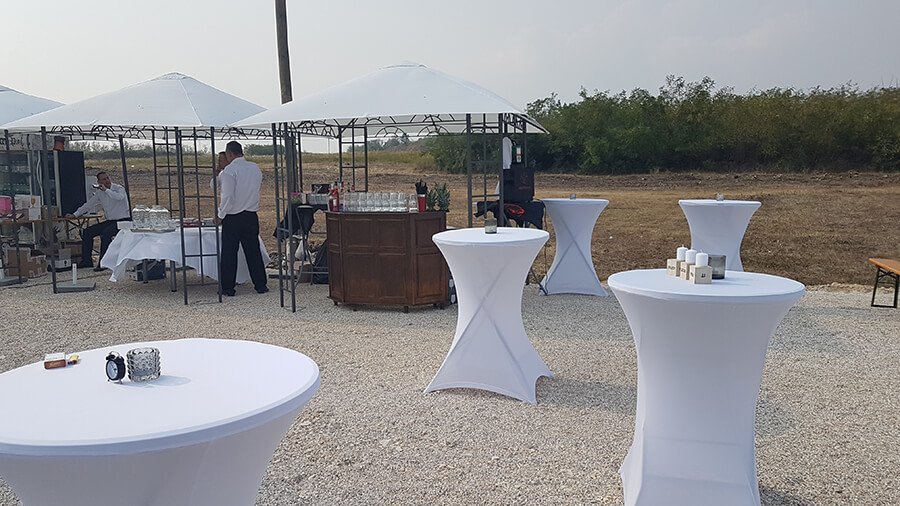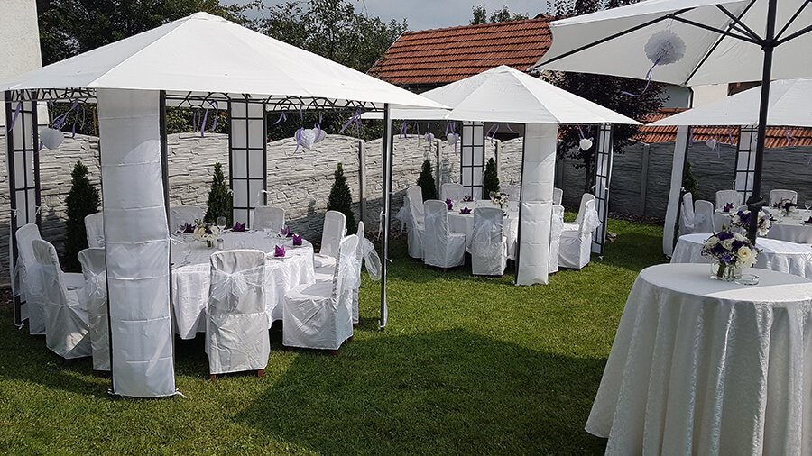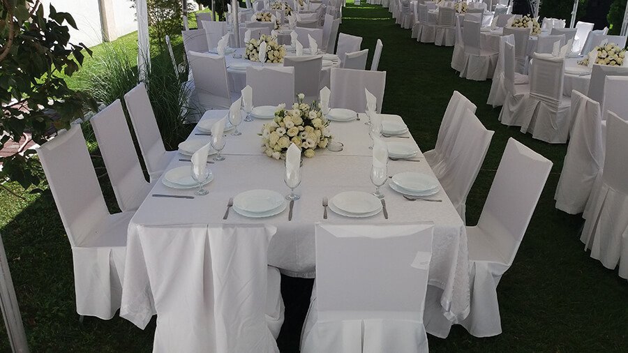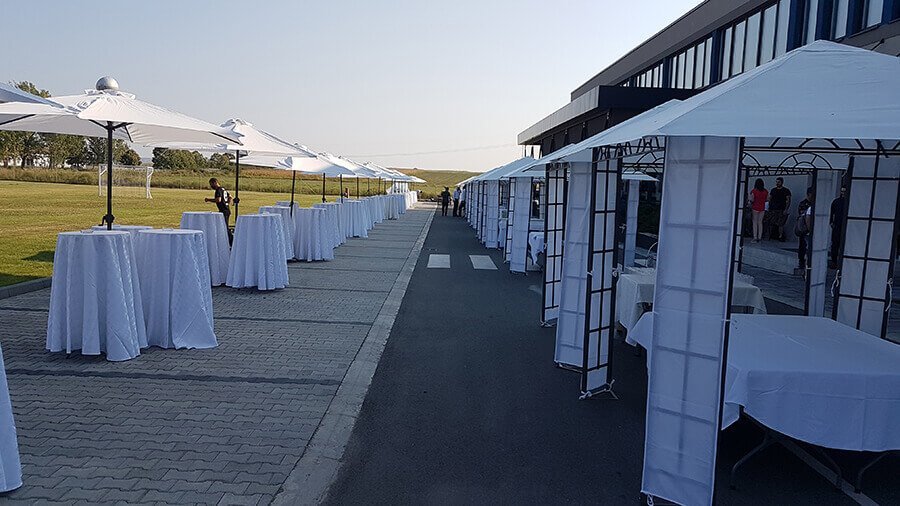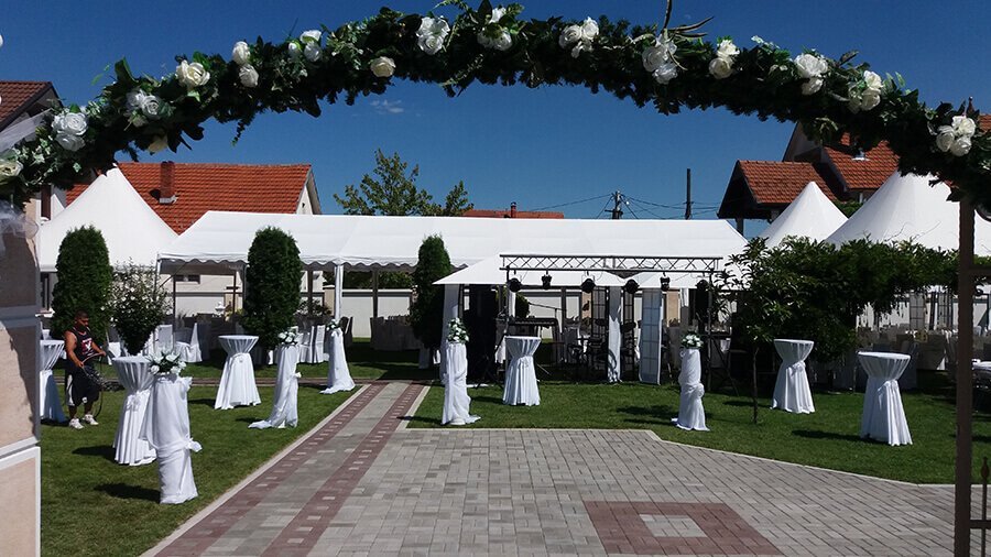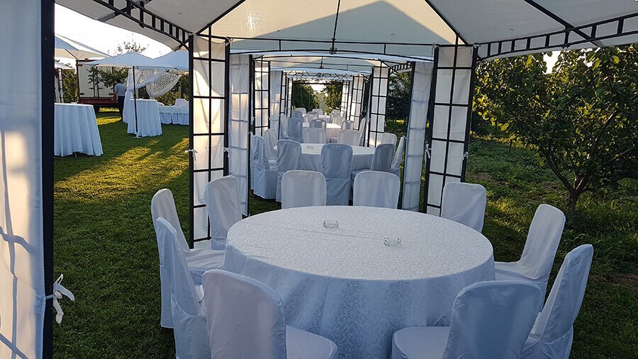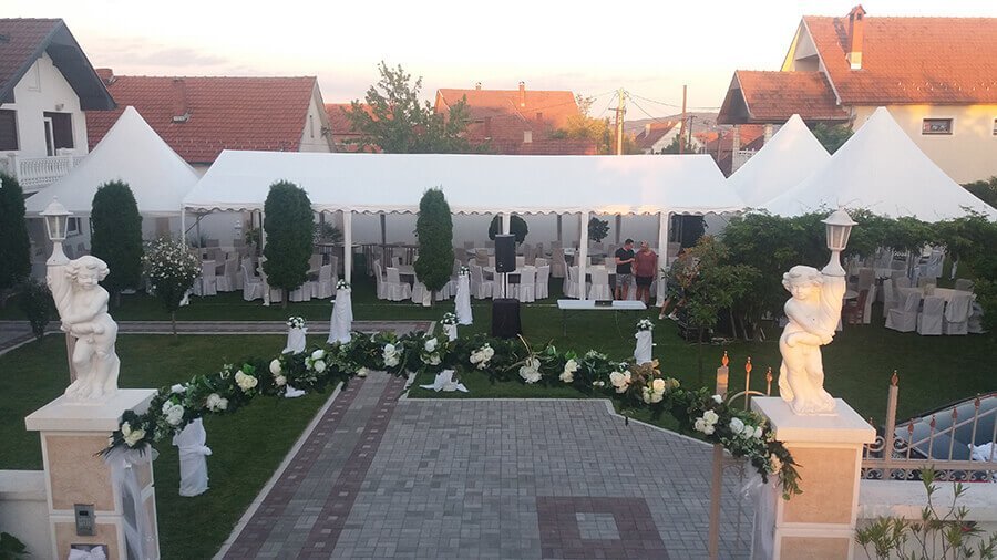 U ponudi su kvalitetni, elegantni, beli šatori, modernog dizajna, čija je dužina prilagodljiva Vama i Vašim potrebama, kao i mogućnostima prostora na kome želite da postavite šator. Kapaciteti šatora su od 80 do 220 sedećih mesta. Svi šatori se mogu urediti i dekorisati prema vašim željama.