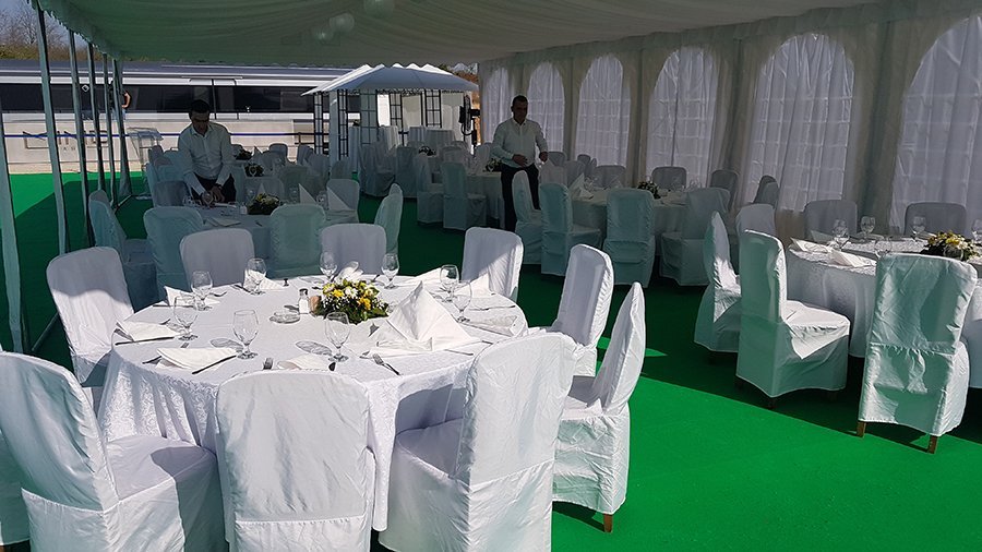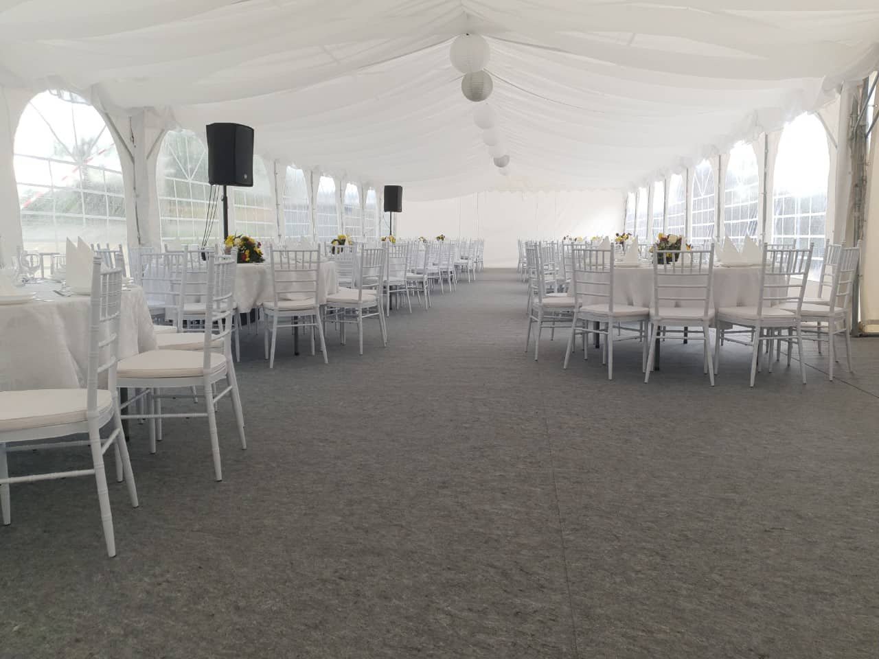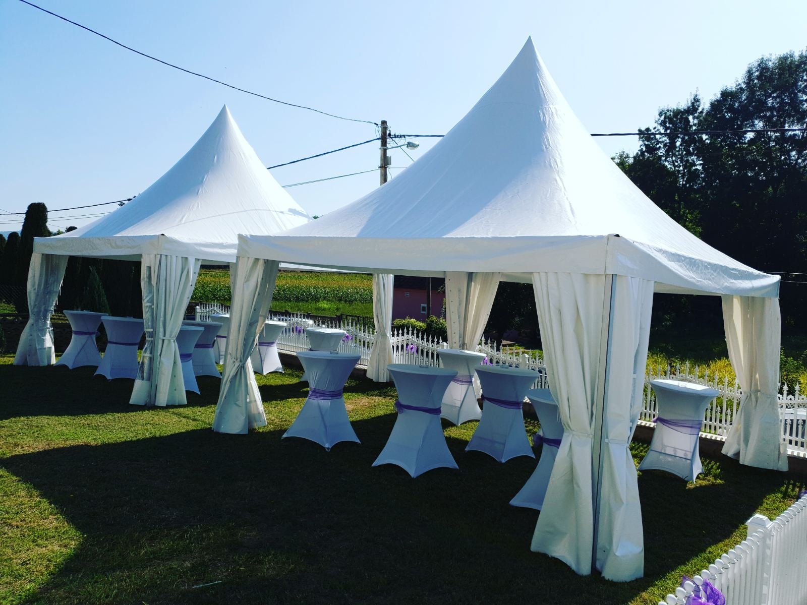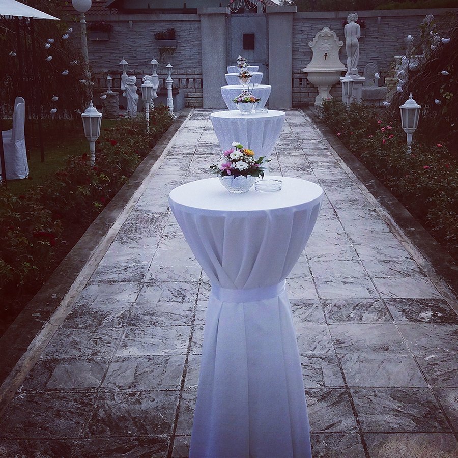 U ponudi su kvalitetni, elegantni, beli šatori, modernog dizajna, čija je dužina prilagodljiva Vama i Vašim potrebama, kao i mogućnostima prostora na kome želite da postavite šator. Kapaciteti šatora su od 80 do 220 sedećih mesta. Svi šatori se mogu urediti i dekorisati prema vašim željama.